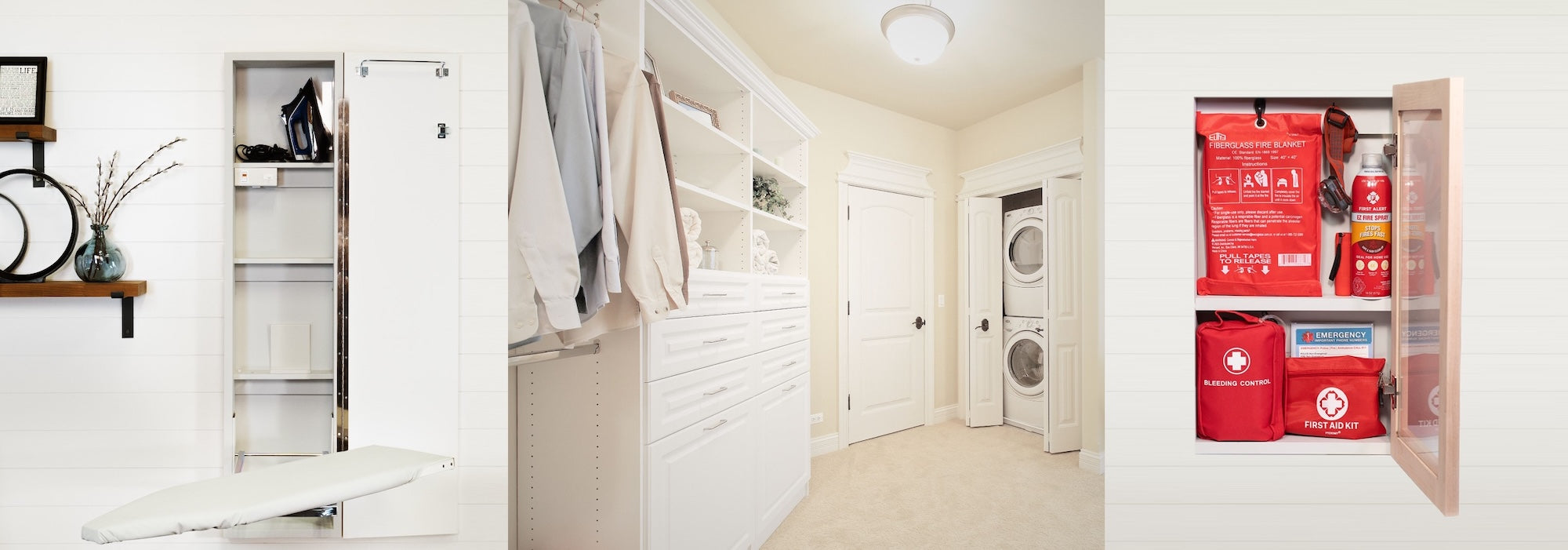 The EAC27M cabinet offers immediate access to critical emergency resources, including a HeartSine-Samaritan or Phillips HeartStart AED, a comprehensive first aid kit, Boost Oxygen, a hands-free headlamp for low-light conditions, and readily accessible fire suppression tools (blanket and spray).