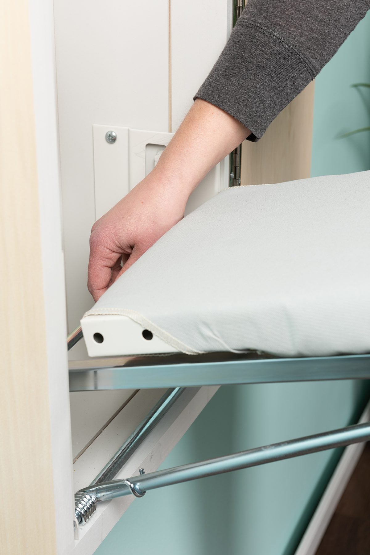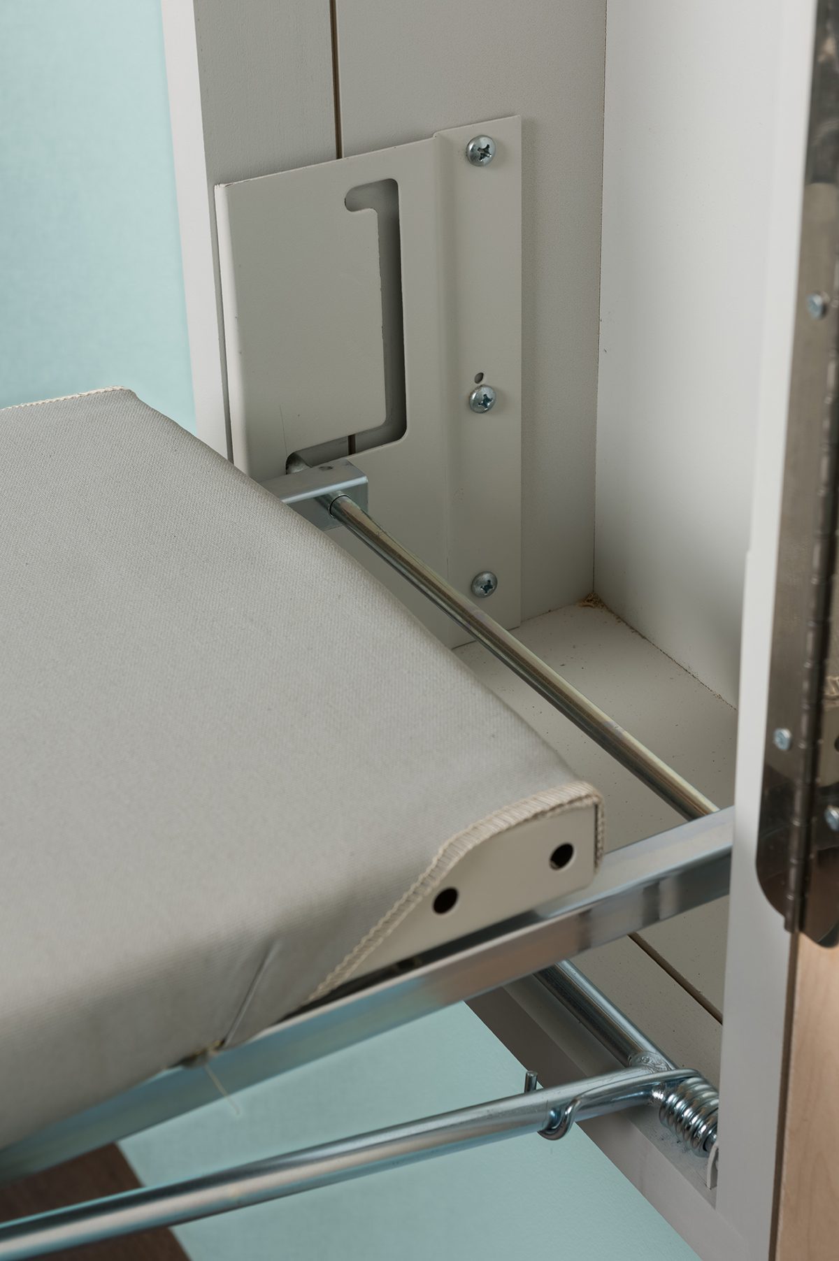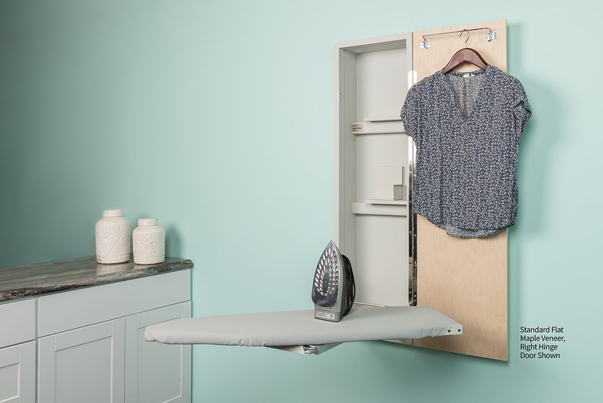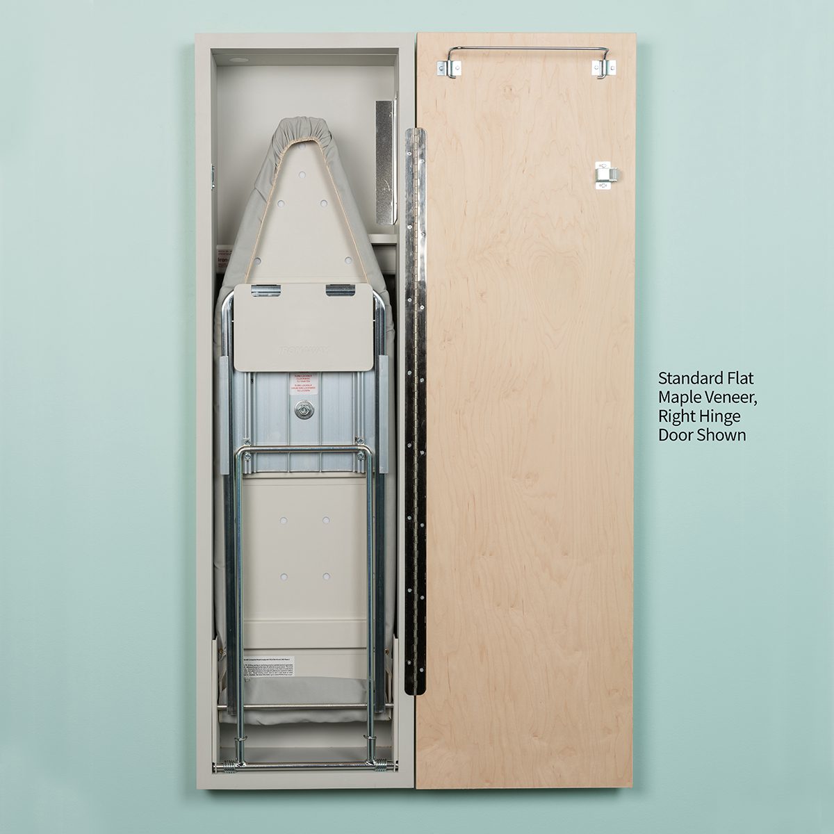 Find the perfect ironing board position with the non-electric, adjustable swivel model ANE-42 built-in ironing center. The spring-activated adjustable swivel pivots the ironing board 90 degrees left or right for a full 180-degree turn, with five locking positions. Choose from one of two adjustment positions to find your most comfortable ironing height. The 42-inch ventilated metal ironing board creates an evenly heated surface, perfect for steaming out those tough wrinkles. Safely set the iron aside while adjusting or reaching for a new garment with the hot iron rest feature. This built-in ironing center is perfect for locations with a nearby outlet and is complete with a premium hot iron storage area. Cabinet interior is pre-finished in a cool grey and the exterior is unfinished, ready to be painted or stained.